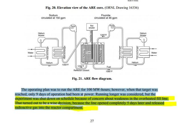 «Cuando estaban a punto de llegar a la potencia de diseño de 100 MW/h se dieron cuenta que una de las tuberías de la linea de alta temperatura estaba debilitándose, iniciaron la parada. Eso resultó ser una sabia decisión ya que a los 5 días se rompió dicha tubería desperdigando gases radiactivos por la instalación.»