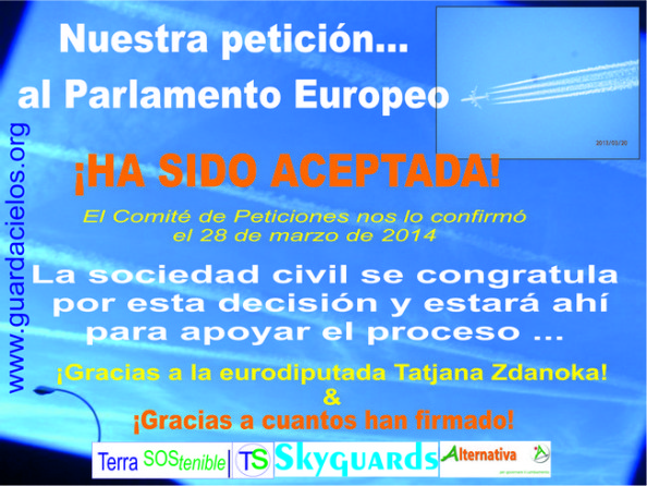 Si recibe este correo es porque en algún momento usted se ha interesado por nuestras actividades. Si no desea recibir ningún correo más por favor nos lo haga saber.Como anunica el título me permito comunicarles una buena noticia: El Parlamento Europeo HA ADMITIDO A TRÁMITE nuestra petición para una investigación independiente de los hechos denunciados en el marco de programas de modificación del clima, como las fumigaciones clandestinas aéreas entre otras cosas.Este es un triunfo de la sociedad civil y desde Guardacielos os agradecemos el apoyo recibido. Las firmas fueron enviadas el 28 de marzo, curiosamente el mismo día en el que recibimos la buena noticia.Ahora nos toca jugar esta baza con inteligencia, vigilar el proceso muy de cerca, y aportar todo tipo de pruebas que puedan incluirse en la investigación.Próximamente os haremos llegar una carta abierta a los candidatos a las elecciones europeas con el fin de conocer su posicionamiento sobre temas de tanta gravedad. El que lo desée puede remitírsela a unos y otros. Nostros se la remitiremos a todos y pondremos sus respuestas o falta de respuesta en nuestra web para que el votante pueda actuar en consecuencia.De nuevo todo nuestro agradecimiento.Cordialmente
