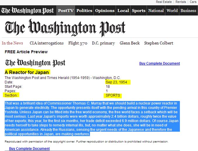 (Nota ampliada de UTP. Este artículo de 1954 (como todos los artículos históricos del Washington Post) es de pago y su reproducción está prohibida. Como podéis apreciar se publicó en la sección de deportes. Dejó al intelecto del lector el pensar porque un artículo sobre algo totalmente novedoso a nivel científico (los reactores nucleares en los años 50 lo eran) fue publicado en una de las secciones mas atrayentes y leídas del periódico…y no precisamente por los lectores mas informados. También podéis apreciar como al final del texto (de la parte que se puede leer de forma gratuita) ya dan a entender que si «ellos» no ayudan a los japoneses lo harían los rusos…)