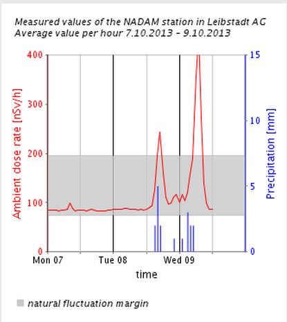 El inicio de la lluvia puede conducir a un aumento temporal de los valores de medición como resultado de la radiactividad producto del enjuague de radionucleidos desde el aire. La intensidad de la lluvia, y la duración del período de sequía anterior son decisivos aquí.