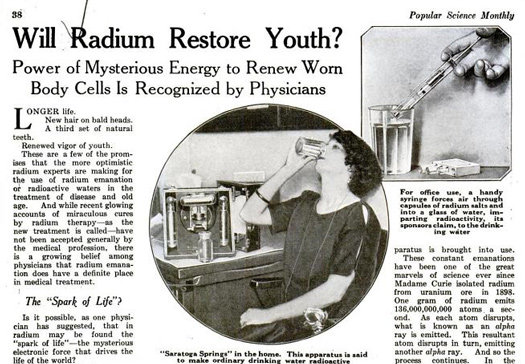 Inyectables para administrar radio (material radiactivo que debe su nombre a su alta actividad radiactiva) en agua que nos harían rejuvenecer. Mas locuras medicas radiactivas aquí.