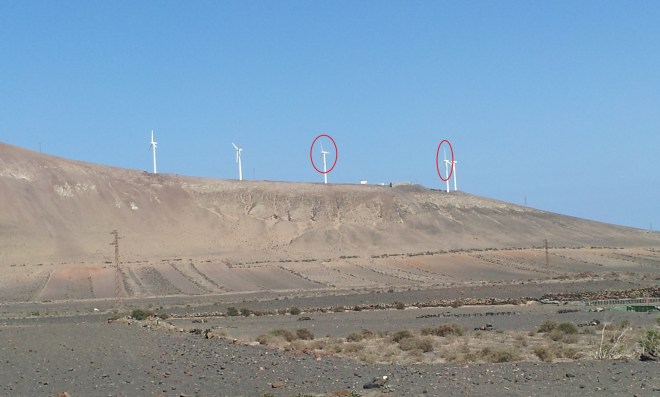 Hay mas de 5 eólicos en toda la isla de Lanzarote, no muchos mas en otro parque, pero es curioso que durante toda la semana que estuve allí esos tres molinos estuvieron parados. Y sin embargo los camiones de gasoil ya que no llega gas natural a esta isla iban y venían día y noche desde la refinería cercana a donde yo estaba trabajando hasta la central de Punta Grande cuyos grupos de gas trabajan con gasóleo como combustible.
