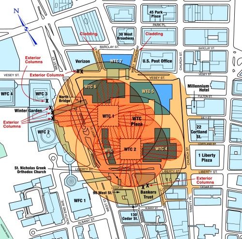 Es mas, el edificio 7 prácticamente no recibió ningún impacto severo por la caída de las torres. Como los que siguen defendiendo la versión oficial nos muestran a través de gráficos de la investigación oficial…