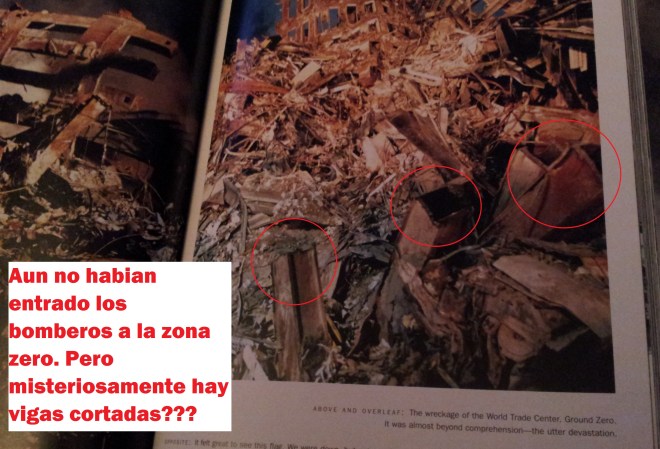 Eso si…los muy imbéciles muestran esta fotografía (ojo, es la única en toda esta ignominia hecha libro) donde podemos ver como las vigas, las vigas del sótano han sido seccionadas con algún tipo de corte por alta temperatura…aquí todavía no habían llegado bomberos ni equipos de rescate.