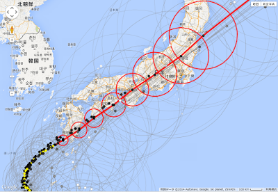 Se espera a la tierra en la prefectura de Kagoshima en Kyushu en la mañana del 13 de octubre de 2014, luego a través de Shikoku, Kansai, Chubu, Kanto, Tohoku sur, en línea recta, más o menos.