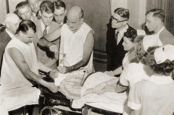 Walter Freeman, right, and James Watts performing a prefrontal lobotomy in 1942. Special Collections Research Center, The George Washington University