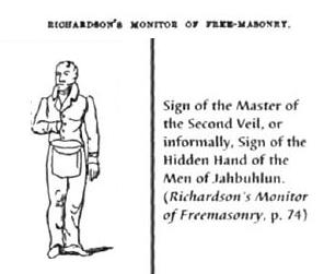 El signo de la «mano escondida» es, a fin de cuentas, el signo de Jah-buh-lun (Jahbuhlun), el dios sagrado de la masonería (el gran arquitecto del universo)   cuando el Masón aprende el nombre deJahbulun en la recepción del grado 13 en el Rito Escocés o el 7 º grado para el Rito de York (conocido como el secreto del masón, o el grado del Royal Arch [63] ).