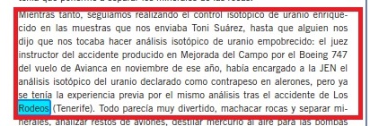 “…Ya en una conferencia celebrada en el Club de la prensa en Tenerife en 1979 que dí junto con mi amigo Alfonso del Val, éste denunció la presencia (detectada por un chatarrero local) y el peligro del uranio empobrecido por ser un material barato y de alta densidad incluido en los Jumbos que colisionaron en el aeropuerto de los Rodeos. El accidente mayor de la historia de la aviación hasta el momento.