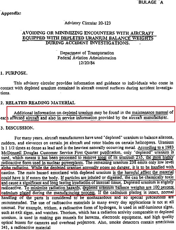 Counterweights or ballasts in aircraft significa contrapesos o lastres en aviación. Estos fueron elaborados por la compañía Starmet. Compañía que ha incumplido todas las normativas referentes a seguridad pero a la que se le ha dejado continuar con su actividad ya que es una de las que fabrican las balas perforadoras de uranio empobrecido. Por desgracia las referencias contenidas en artículos antiguos van siendo borradas.