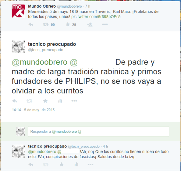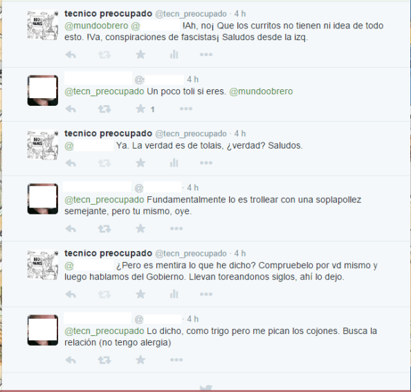 Lo que me ha impulsado a escribir este primer articulo ha sido ver como la gente que dice ser de izquierdas sigue sin enterarse de nada. He tapado el nombre de la persona con la que he mantenido este dialogo de besugos, pero pueden localizar los tuits en mi historico.