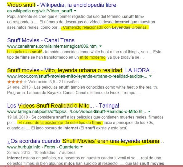 Empecemos por Wikipédia, el portal de la propaganda yupilandia . El único artículo dedicado a los snuffs movies, éstas películas rodadas generalmente sobre pedido, poniendo en escena asesinatos, habla de la película “Snuff”salida en 1976. En la época, se debatió mucho sobre si el asesinato y desmembramiento del cuerpo era real o no, antes que el realizador dijera que se trataba de una ficción. La página en francés no es mejor, solo habla de los snuffs en el cine. El golpe clásico sigue después: ya que trata de una película, és falso, los snuffs no son más que fantasías y no existen.