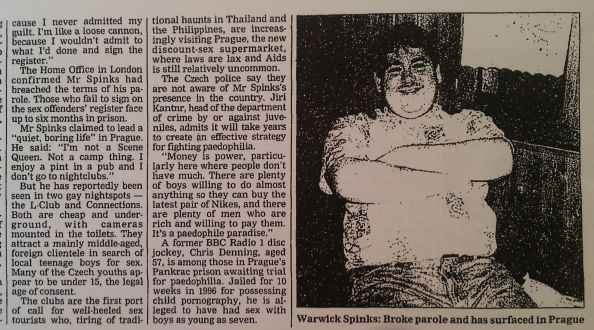 También hemos hablado mucho de Warwick Spinks, ese pedófilo inglés que se encontró entre los exiliados a Amsterdam a principios de los años 90. Dijo a un policía encubierto, que conocía gente en Amsterdam implicada en la producción de snuffs. Pero extrañamente, el presupuesto para ésta investigación fue suprimido antes que los policías avanzarán. Según los militantes Belgas, Spinks (foto derecha, en Praga donde desarrolla turismo “gay”) vendía videos al precio de 6.000 euros la pieza desde los inicios de los años 90, y a éste precio nos cuestionamos si no se trataba de snuff movies.