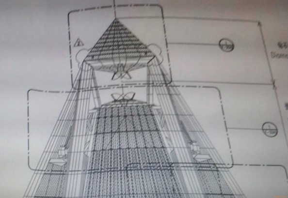 Al final su pirámide de 33 metros de altura lucirá con dos faros, uno arriba y otro abajo (como es arriba es abajo que dicen ellos). Por cierto según los planos es un diamante…je, je, je.