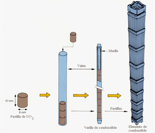 Un rack o elemento combustible es un conjunto formado por diversas varillas huecas rellenas de pellets de UO2 que terminan formando la estructura azul de la derecha y preparado para ser introducido directamente en el núcleo de un reactor nuclear…