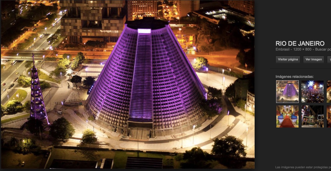 La Catedral de Río de Janeiro una curiosa catedral moderna con forma de octágono con dos torres al fondo y con una preciosa iluminación…el lila le sienta de muerte.
