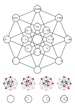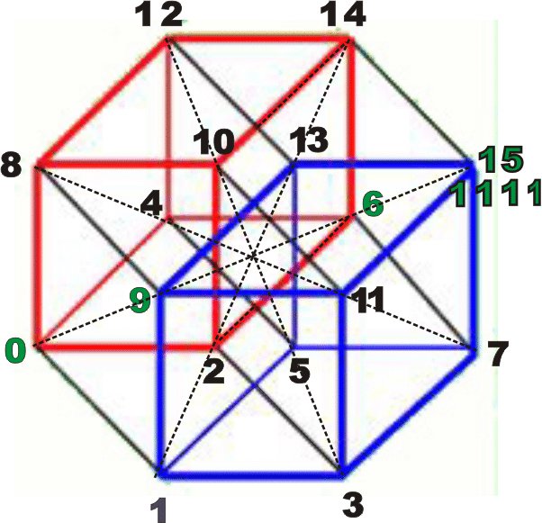 Diagrama de Hasse de un hipercubo. Los vertices internos superior e inferior corresponderían con el 9 y el 11.