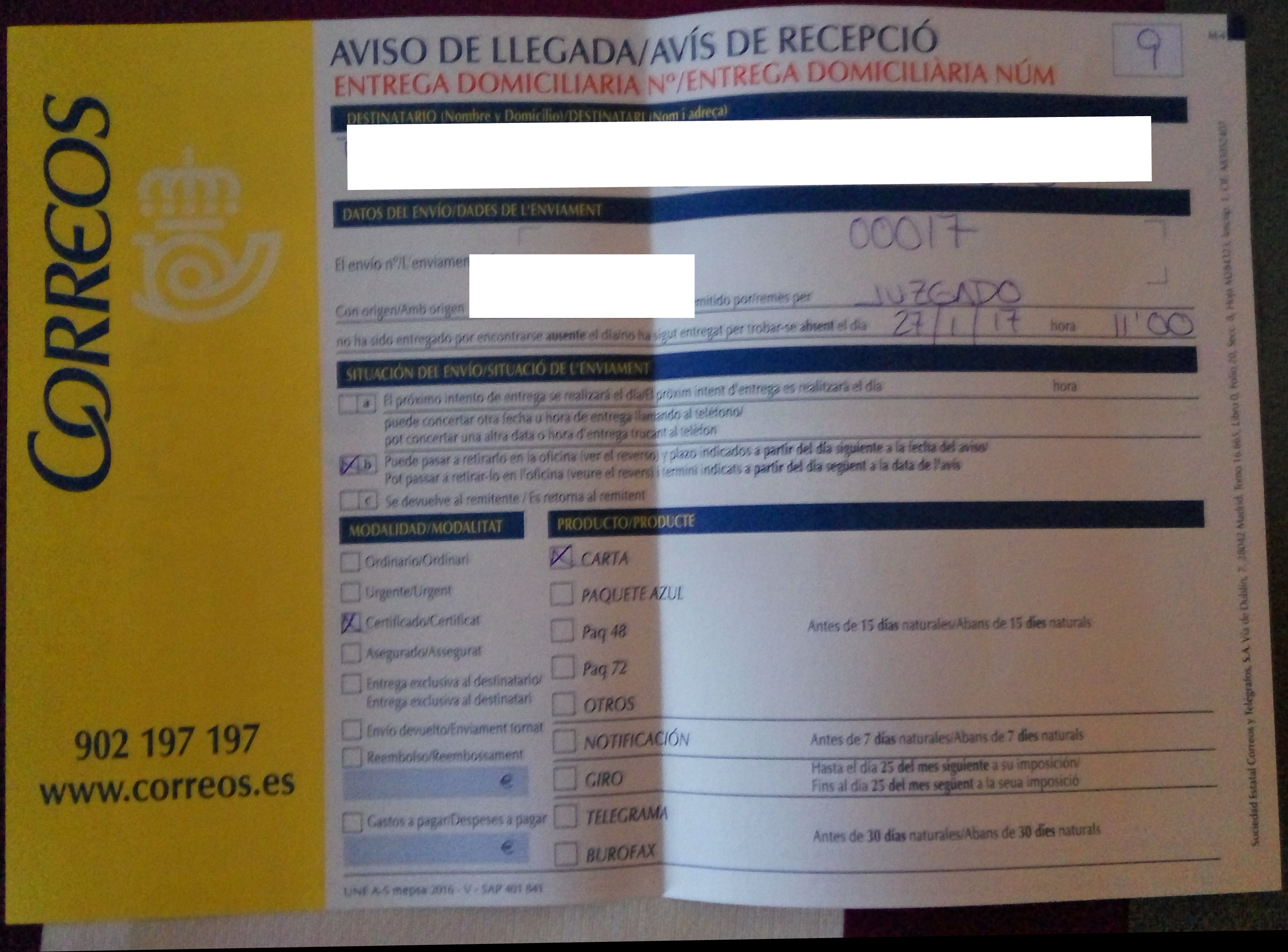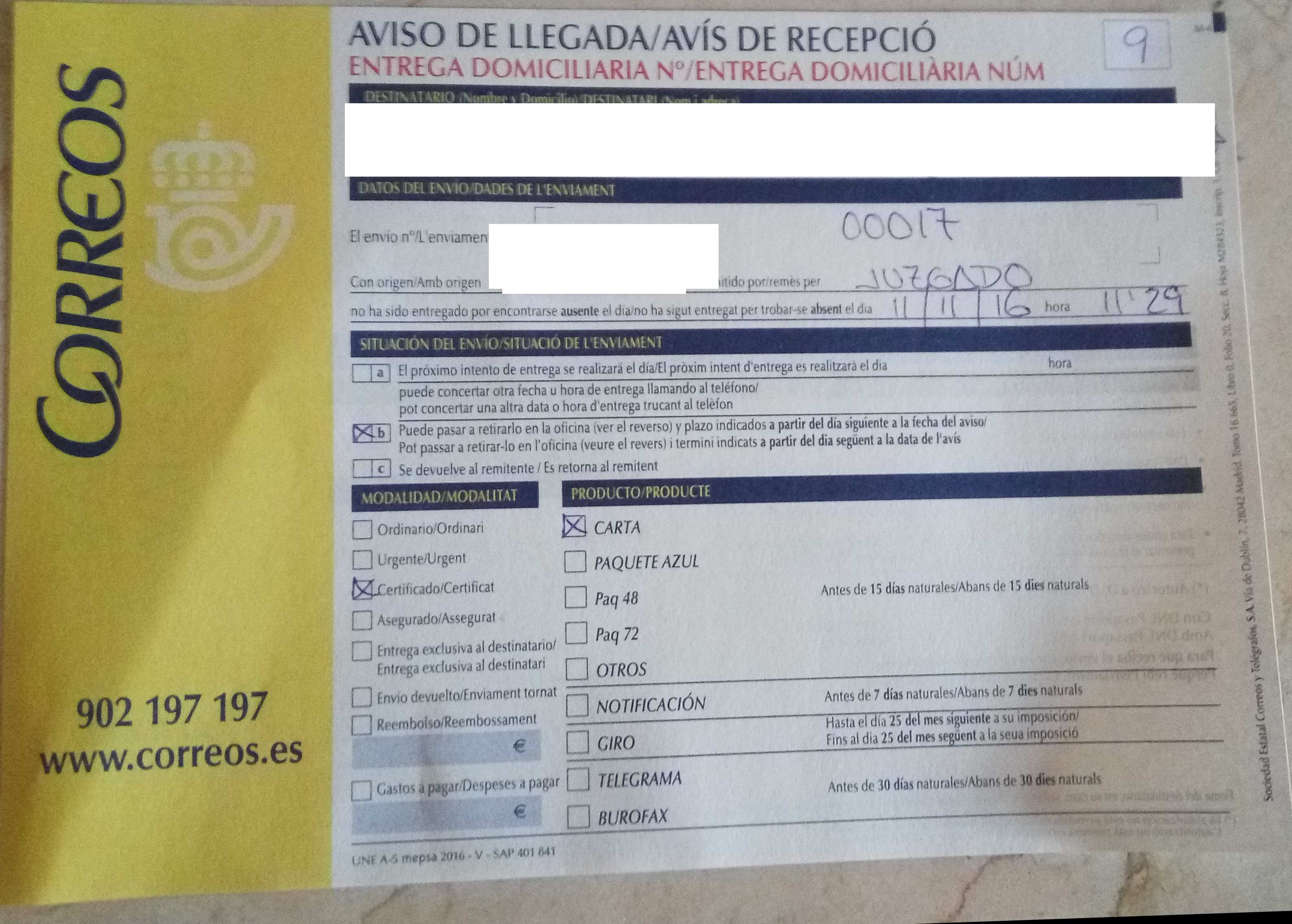 Por cierto, los avisos siempre llevan un 9, sean los de recoger en correos (esquina superior derecha) o de forma más o menos directa como este 27 escrito a rotulador en el propio sobre.