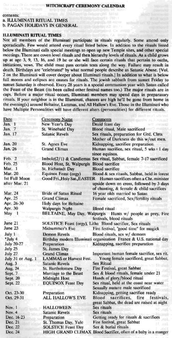 Para empezar quiero mostrarles el calendario que utilizan todos los satanistas del mundo. Este tipo de calendarios han sido mostrados por el FBI y otras agencias en sus investigaciones lo cual podemos comprobar en documentos desclasificados que investigadores como CSI Juan van sacando a la luz.