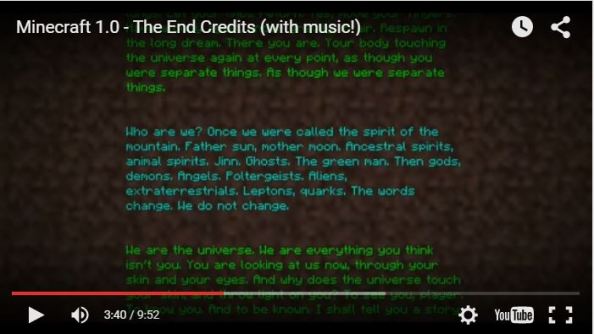 Me despido mostrándoles los créditos finales del famosísimo juego Minecraft al que por cierto es muy aficionado mi pequeño vástago (hija).