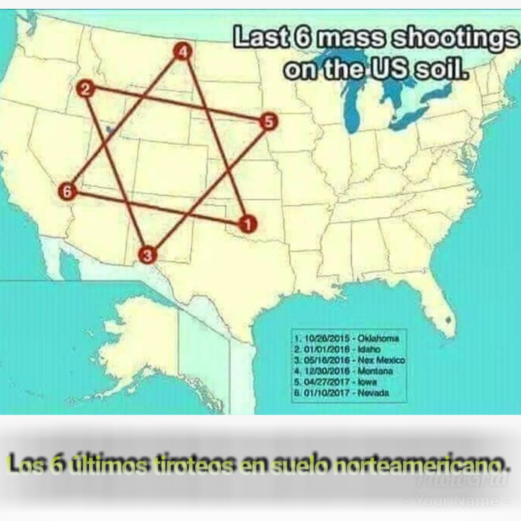 (Nota de UTP. Suelo contrastar este tipo de informaciones que muestran este tipo de cosas tan curiosas, me refiero a ese supuesto hexagrama evidenciado por esos 6 tiroteos en los USA. Desgraciadamente con la cantidad de muertos y heridos por arma de fuego (reales o flase flag para el caso es lo mismo) en los Estados Unidos se podría dibujar casi cualquier cosa.)
