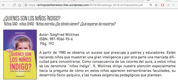 Como no podía ser de otra manera en la antroposofía o en los grupos que toman el pensamiento de Steiner no puede faltar el tema de los niños índigo. Curiosamente y al igual que el boom en la pedagogía Waldorf de los 80 el tema de los niños índigo nace en esos años con un libro de la corriente New Age llamado Understanding Your Life Through Color, de Nancy Tappe, otra contactada que decía poder ver el aura de las personas.