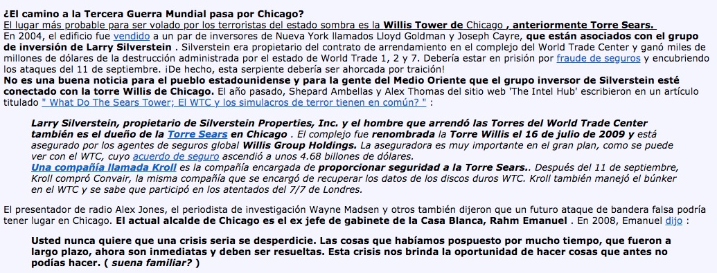 “Larry Silverstein, propietario de Silverstein Properties, Inc. y el hombre que arrendó las Torres del World Trade Center también es el dueño de la Torre Sears en Chicago . El complejo fue renombrada la Torre Willis el 16 de julio de 2009 y está asegurado por los agentes de seguros global Willis Group Holdings. La aseguradora es muy importante en el gran plan, como se puede ver con el WTC, cuyo acuerdo de seguro ascendió a unos 4.68 billones de dólares.