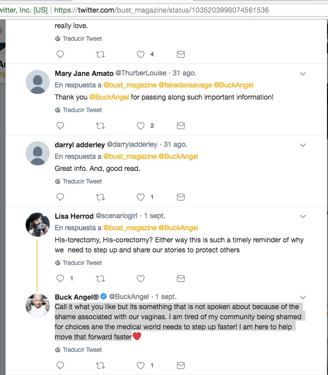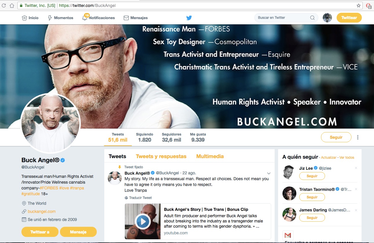 El tal buck angel, el machote con vagina, tiene un perfil en twitter con 24.000 seguidores. Ni decir que es espantoso todo lo que promociona este «tipejo».