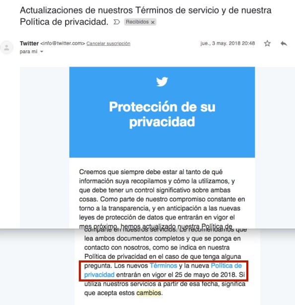 Os acordareis de ese montón de emails que os llegaron el año pasado entre febrero y mayo diciendo que las condiciones del uso de Facebook, de Twitter del propio Google habían cambiado…pues en la letra pequeña incluía la modificación de la ley de protección de datos y por ende la implementación del PNR.