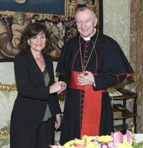 Cardenal Parolin ministra Carmen Calvo saludo masónico