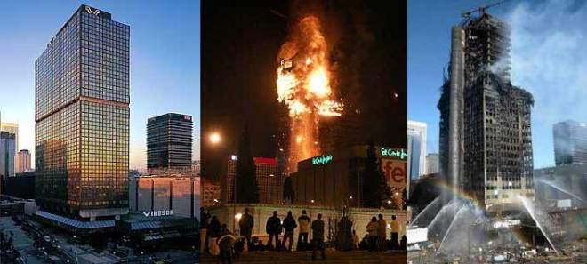 La Torre Windsor, de Madrid, ardió durante 20 horas – como una antorcha – y su estructura y la gran grúa de obra del techo aguantaron como si nada.¿Te acuerdas? Fue en 2005. También, en 1975, la torre gemela norte ardió durante 3 horas entre los pisos 11-27 (el doble de tiempo que el 11-S y con más fuego), sin siquiera insinuar ningún riesgo de colapso. Compara 20 horas de pura llama del Windsor, con 90′ de humo el 11-S. Un chiste.