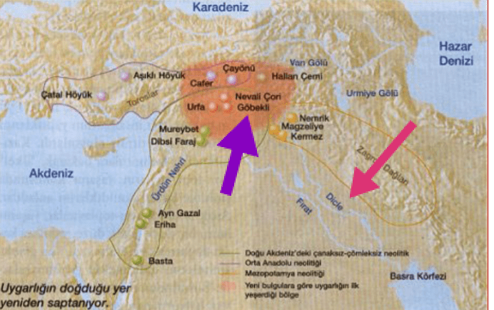 Sumeria, mal denominada cuna de la civilización como estaréis observando, surge en 6500 a. C. ¿Entonces que pasó con los habitantes de Göbekli Tepe de Anatolia que no parecen ser los mismos según el lenguaje que destaca la VO? ¿Fueron capaces de levantar esas estructuras y quedarse sin desarrollo hasta que surgió Sumeria? Observen la ubicación de Göbeklii Tepe con respecto a Sumeria (flecha rosa). Veís, que están relativamente cerca