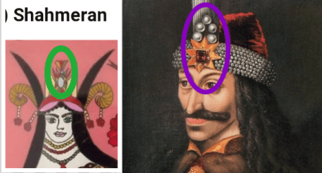 Este ser mítico para los pobladores se encarga de tratar y curar a los enfermos, por lo que en los diversos relatos que se hacen sobre este personaje se habla de su compasión, sacrificio y bondad. También se piensa que sabe el secreto para tener una vida larga y eterna. Si os fijais en el Lirio que tiene en la cabeza veréis un símbolo parecido al que llevaba Vlad el Empalador, que analizamos en la primera parte y por ende la disposición en quincunx de los roeles rojos Médici.