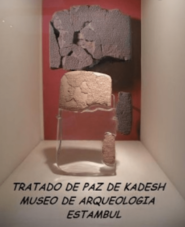 El choque contra Egipto se produjo en la batalla de Qadesh (h.1274 a. C.) donde sus tropas y las de Ramsés II se irán sin una victoria decisiva para ninguna de las partes aparentemente. Firmaron el Tratado de Paz más antiguo que se conoce, por el que ambos Imperios se ayudarían mutuamente en caso de guerra: el Tratado de Qadesh, que se exhibe en el edificio de Naciones Unidas en Nueva York. (Nota UTP. Puedes encontrar una versión traducida al ingles aqui y tambien en esta otra pagina, ambas ya desaparecidas)