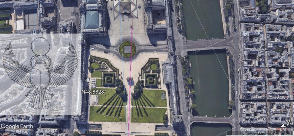 Empecemos por la pirámide de cristal del Louvre, que no es una pirámide sino un octaedro, puesto que bajo el suelo de la misma hay otra pirámide invertida que “ilumina” el interior del lugar. Tras la estatua ecuestre de Luis XIV, el “rey Sol”, que fija la línea central del “eje histórico”, encontramos una pirámide invertida que penetra la tierra, un elemento. Recordemos un poco la descomposición de la luz experimentada por Newton al pasarla por la primera pirámide-prisma y la vuelta a la materialización de la misma pasando por el segundo prisma-pirámide invertido. Comienza el control de los elementos. Visualmente también es perceptible este octaedro debido a los estanques de agua adyacentes a la pirámide de cristal que realizan la labor de espejo. Otro elemento dominado.