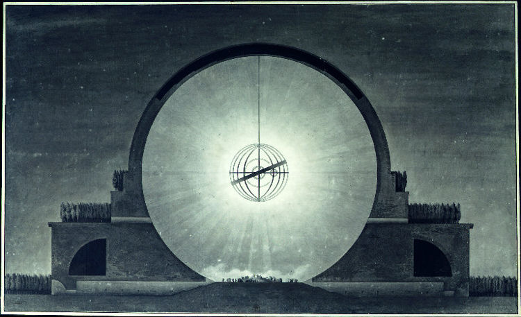La mitificación de Newton como nuevo mesías científico llegó muy pronto. Concentraron en su figura los “nuevos saberes”. Ejemplo es el proyecto de mega-monumento que ideó el arquitecto francés Étienne-Louis Boullée (1728-1799). Un cenotafio (monumento funerario sin cuerpo) dedicado al científico-alquimista-ocultista inglés. 150 metros de esfera de la que exteriormente sólo se vería la mitad superior, quedando la inferior sujeta mediante anillos perimetrales. Dentro estaría hueca, con un sarcófago representando al cuerpo de Newton, en el punto de conexión de la esfera con la tierra. Estaría perforada por agujeros que dejarían pasar la luz diurna. Una enorme lámpara colgante para iluminar la gigantesca esfera de noche y convertirla en una especie de planetario. El proyecto nunca se llevó a cabo, pero plasmaba también, esa obsesión por “atrapar la luz” y encerrarla para unos pocos. Eso sí, “iluminando” desde la cripta ese “conocimiento” hacia la humanidad con nocturnidad, y poquito… sólo por unos agujeritos, no sea que nos atragantemos de conocimiento.