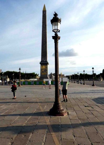 De allí, la línea atraviesa los jardines de las Tullerías, creados por orden de la reina María de Médicis a mediados del siglo XVI, hasta llegar a la Plaza de la Concordia. Aquí, el eje atraviesa el Obelisco del Templo de Lúxor, hermano del otro sito en su lugar original. Ambos procedentes de las canteras de Asuán. Colocado ahí por orden del último monarca francés, Luis Felipe I, en 1836. La colocación del piramidión en su cumbre, con láminas de bronce y oro, con la base y el pedestal, lo llevan hasta una altura de 33 metros.