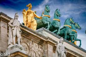 Seguimos observando el modesto, en altura, arco del triunfo del Carrusel. Erigido por orden de Napoleón en 1808. Desde allí se puede observar la perfecta alineación con el resto de monumentos del eje. Los caballos de la cuadriga que están en lo alto del arco son copias de originales griegos de bronce dorado del siglo IV a. C. que venían del Templo de Apolo, portador del Sol, de Corinto (guiño a la luz).