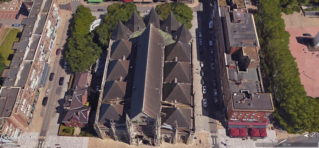 Vayamos al punto septentrional del ritual-científico-geodésico. El Beffroi de casi 60 metros de altura fue la referencia visible de la medición en Dunkerque. Anteriormente unida a la gran iglesia de Sant Eloí, que tras varias reconstrucciones, demoliciones y revoluciones, quedaron separadas definitivamente en 1782. Esta iglesia posee una característica que llama la atención. Está rodeada por arriba de 13 pirámides. 8 pirámides cuadrangulares a los dos lados del tejado, formado por una suerte de prisma, y las otras 5, de forma hexagonal, rodeando el ábside de la iglesia. Me lleva a recordar el misterio de Osiris desmembrado en 14 partes por Seth y unidos por la magia de la diosa Isis, que sólo pudo reunir 13 partes, siendo el falo de Osiris devorado por el pez oxirrinco. La diosa, a través de la magia, pudo reconstruirlo. La forma de gran obelisco truncado del campanario civil colindante a la iglesia, daría pie a un ritual mistérico por parte de los geógrafos-iluminados que uniría el conjunto arquitectónico.