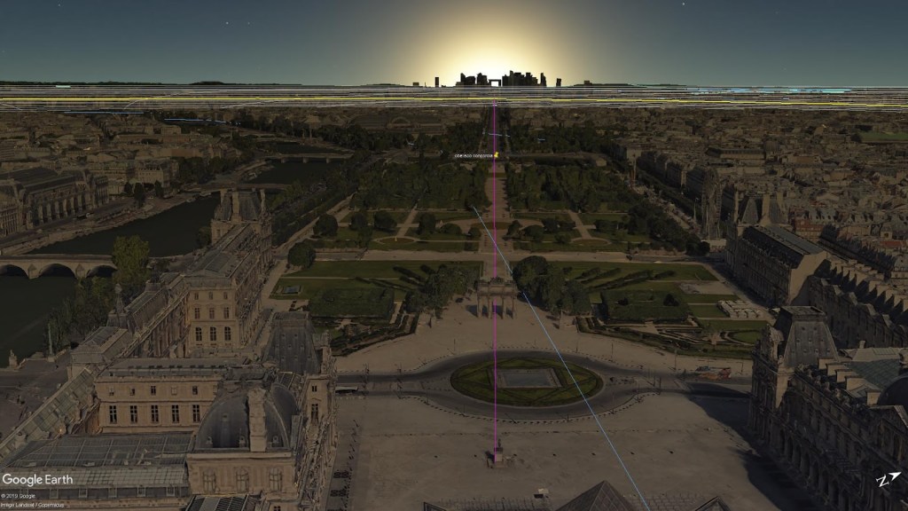 Y parece que alguien “echó las cartas” a los monumentos. La pirámide del Louvre fue inaugurada por el presidente francés el 29 de marzo del año del bicentenario revolucionario (1989). El hipercubo tetradimensional del otro extremo del eje-línea Ley se inauguró 111 días después (18-7-1989), coincidiendo con los 111 metros de altura. Les estaba quedando chula la recta. También se produce una extraña coincidencia en el giro con respecto al eje de los Campos Elíseos. El eje del Palacio del Louvre está girado 6.3º hacia el Oeste con respecto a los jardines de las Tullerías y demás enclaves. La Pirámide de Ming Pei, también. Lo raro es que el Gran Arco de la Defénse también está girado 6,3º sobre este eje, en este caso hacia el Este. Teóricamente lo hizo así el arquitecto danés para darle profundidad visual al hipercubo. Parece un efecto como queriendo jugar con el tiempo, el espacio y la luz. La puesta de Sol en relación a este eje-línea Ley en el día de Walpurgis, o primero de Mayo, parecen converger en ese punto.