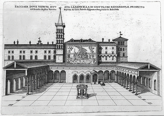 Entrada de la antigua basílica del Vaticano con «La Navicella» en la pared central.