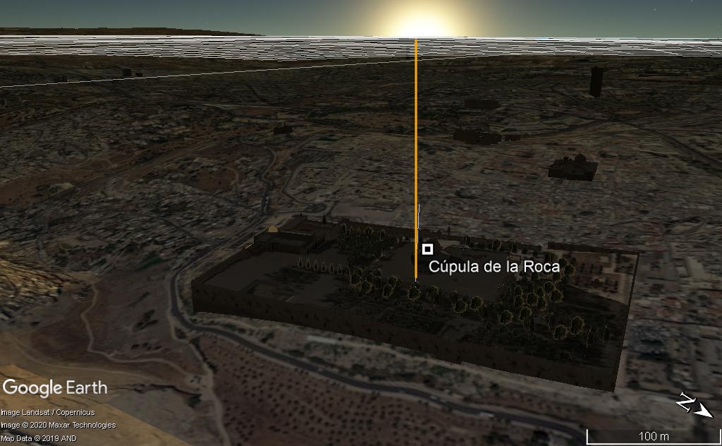 El emplazamiento histórico de ambos monumentos es curioso y se pierde en la historia. La Pirámide, erróneamente llamada de Keops (o Jufu), mira en el amanecer del solsticio de verano en dirección al Templo de La Roca de Jerusalén; e inversamente ocurre este fenómeno durante la puesta de Sol del solsticio de invierno desde la vista de la piedra donde las tres religiones monoteístas obtuvieron revelaciones divinas. Se produce así, un juego simbólico de nacimiento y muerte entre estos dos enclaves. Algo que puede verse reflejado en la liberación del pueblo hebreo de la esclavitud a la que eran sometidos por los faraones de Egipto (muerte como pueblo esclavo), siendo conducido hacia el nacimiento del Sol, sometido a innumerables pruebas iniciáticas para conseguir la libertad de la Tierra Prometida (renacer como pueblo libre). ¿Qué puede ser esa distancia de 440 kilómetros?