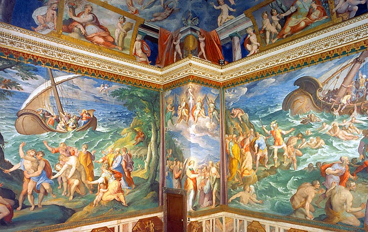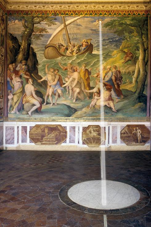Danti, ideó una serie de pinturas en las estancias de la torre donde plasmarían estudios sobre los vientos, los cielos, la tierra y las estaciones, tanto teológicos como seculares. Las pinturas fueron realizadas por especialistas decoradores ilusionistas, como Cristóforo Roncalli, alias “POMARANCIO”, y sus colaboradores. La sala principal fue la “Sala della Meridiana”. Allí se grabó en el suelo una línea meridiana a exactamente 1º y 10 minutos con la diferencia calculada del desfase del calendario. En la pared sur de la sala se había plasmado un fresco con un agujero gnómico situado a 5 metros de altura. La pintura está dedicada a un pasaje de los evangelios donde Jesús, calma los vientos y las aguas, para llegar a tierra en la barca con sus discípulos: