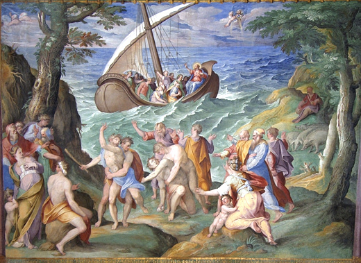 La demostración de domino de astrología, astronomía, cabalística y la utilización de representación mitológico-religiosa con respecto a dicho domino, no hacen más que dirigir conclusiones hacia un uso “más allá” de lo aparente de estos cambios. Como pequeña muestra comentaremos la anterior grandilocuente imagen que se mostraba en la pared de entrada de la antigua basílica de San Pedro. Se trata del fresco del pintor GIOTTO (1267-1337) “La Navicella”. Este mosaico de casi 10 metros de largo mostraba al hijo de Dios caminando sobre las aguas e iniciando a Pedro, el discípulo “elegido” para construir su iglesia, en el dominio de los elementos.