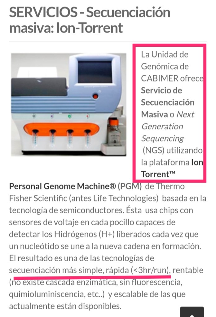 Lo que quiero es que os deis cuenta de que esta tecnología NGS sería capaz de secuenciar masivamente hasta 400 pares de bases (pb). Al coronavirus solo le hacen falta 30.000 bases y al VIH menos. Y todo en 3 h.