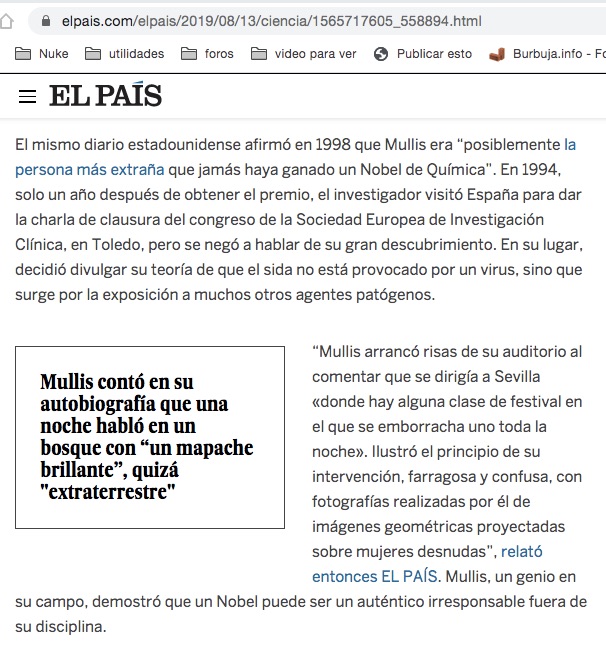 Comparen lo que el propio Mullis contaba en su libro sobre su conferencia en Toledo con lo que el periódico el País escupe en sus páginas…invitas a un Nobel pero solo si cuenta lo que tu quieres que cuente.