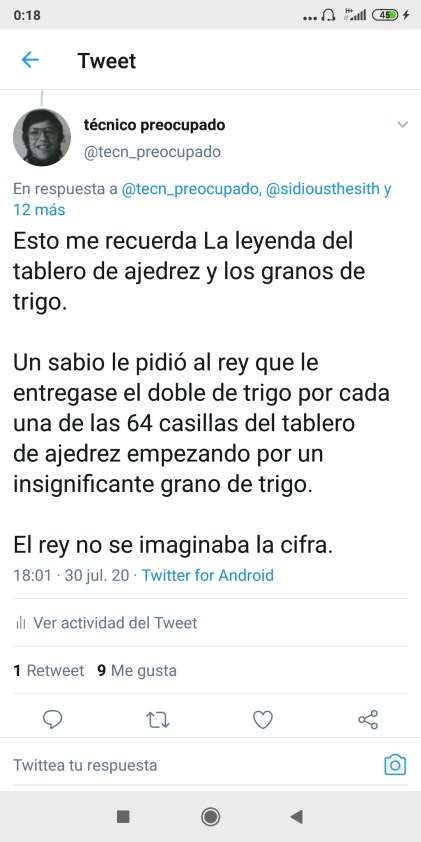 Esto me recordó a la leyenda del tablero de ajedrez y los granos de trigo.