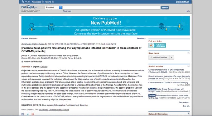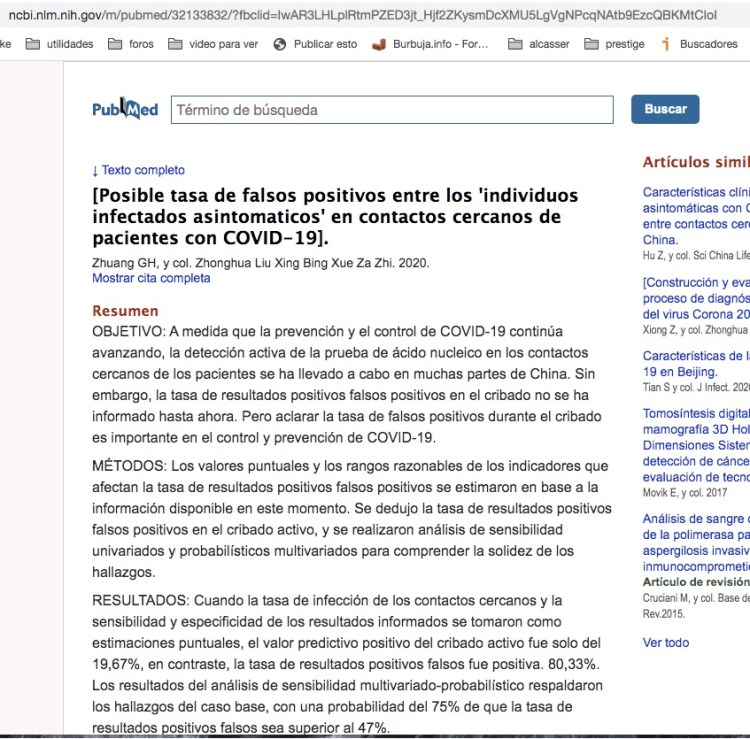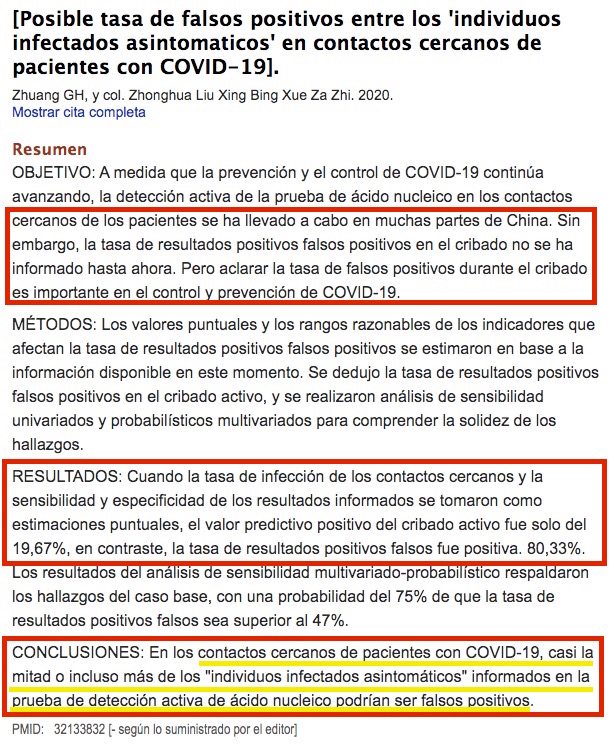 Yo elabore un hilo en marzo de este año mostrando cómo unos científicos chinos habían publicado un paper sobre la alta tasa de falsos positivos titulado «Tasa potencial de falsos positivos entre las ‘personas infectadas asintomáticas’ en contactos cercanos de pacientes con COVID-19»