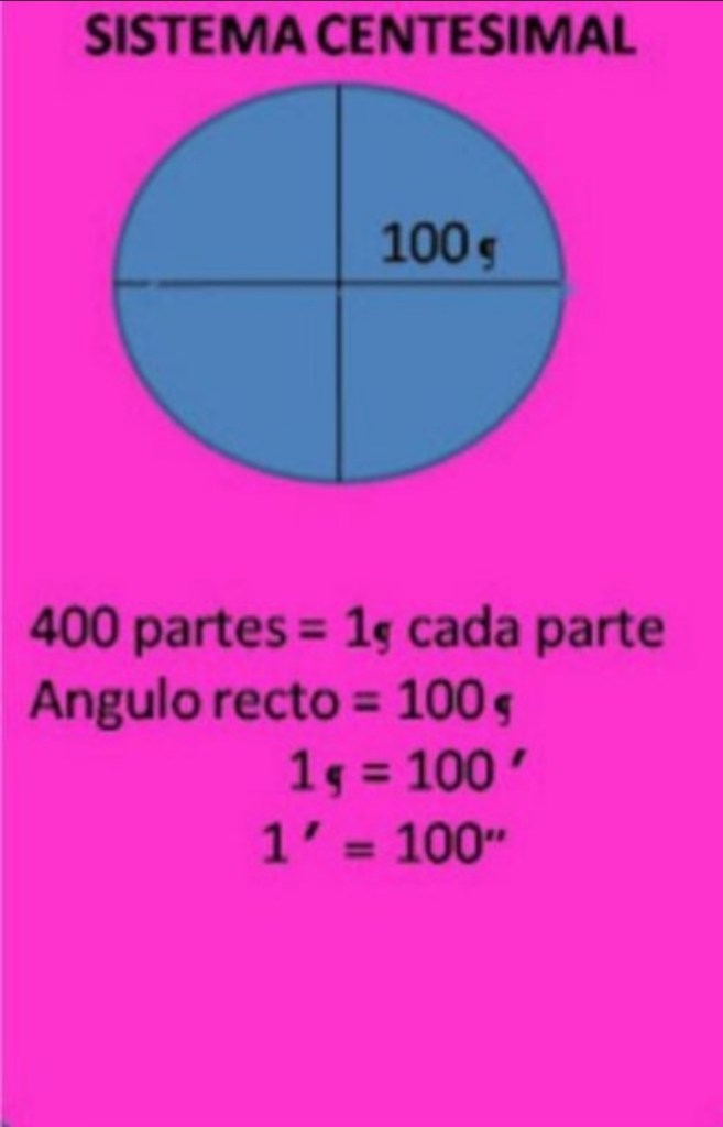 El sistema centesimal divide una circunferencia en 400 partes iguales, o bien, un ángulo recto en 100 partes iguales, y a cada una de esas partes se le denomina grado centesimal o gradián, y se simboliza con una «g» minúscula como superíndice del número, como por ejemplo 35g.