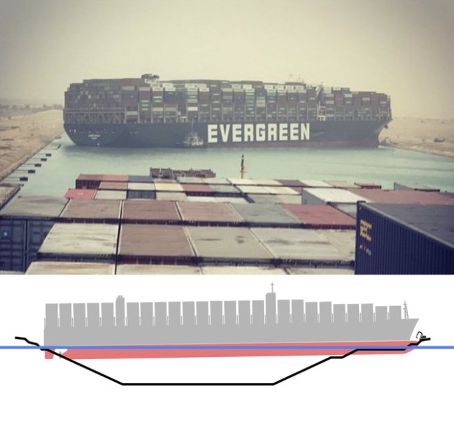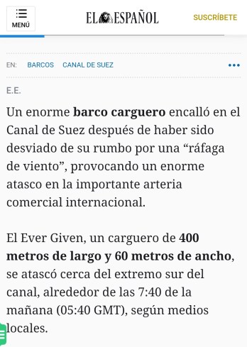 El enorme carguero Ever Given (siempre dado o siempre dispuesto) de 400 metros de eslora (largo), 59 de manga (ancho) y 16 de calado (parte debajo del agua) con una masa en movimiento de 220.000 toneladas se quedo trabado precisamente cuando destrabaron el asunto de las vacunas.