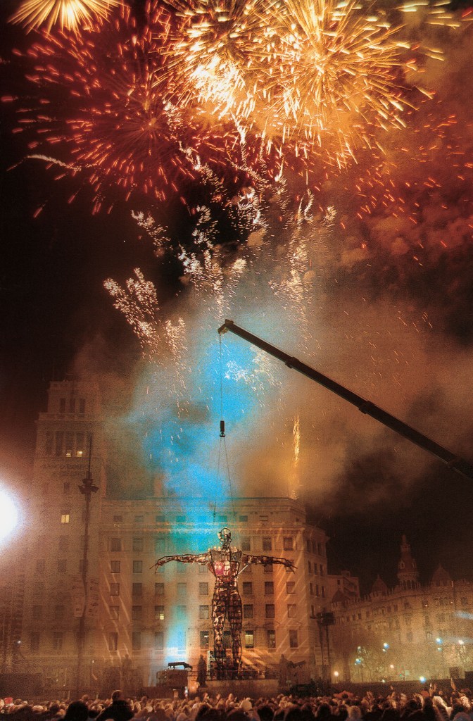 El escenario elegido fue la céntrica Plaza de Cataluña de Barcelona. Nexo de unión entre la ciudad antigua y la moderna, aquella que se empezó a construir en la segunda mitad del siglo XIX con el famoso ensanche de Cerdà. Lo anterior y viejo con lo nuevo bueno. Ese último día del año 1999 (festival de nueves-noves-nuevos) era el ideal para acabar con el antiguo hombre y que renaciera otro. Sacrificarlo de manera metafórica, ritualizar el evento, que fuera visible por el mayor número de personas y en un lugar especial. Pero volviendo a esta explicación del aparente ritual del nuevo hombre milenario, ¿no recuerda un poco o «un mucho» a un ritual que hemos descrito al comienzo de esta investigación? ¿Les suenan aquellos celtas brutotes que describía Julio César y que introducían a unos congéneres en un gran muñeco de estructura de madera y forrado con mimbre? Sí, el ritual del hombre de mimbre o wickerman dedicado a su dios Taranis del cielo y del rayo.